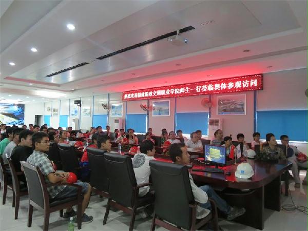 福建船政交通职业学院近50名师生,先在项目会议室观看了项目宣传片及沙盘模型,对项目设计、建设、工程特点、技术难度等方面进行初步了解,随后进入项目施工现场,近距离考察福州海峡奥体中心的新颖独特结构和高难度、高科技的施工作业。