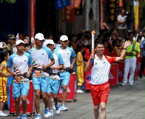 当天上午,青运会组委会副主任、国家体育总局副局长蔡振华点燃圣火盆后,福建省委常委、福州市委书记、青运会组委会副主任杨岳在福州一中旗山校区点燃青运会火炬。随后,来自内地及香港、澳门的100名火炬手接力穿过榕城最繁华的水陆心脏,途径福州一中旗山校区、南江滨九龙壁码头、北江滨台江福头、三坊七巷等地,完成了首届青运会火炬传递仪式。
