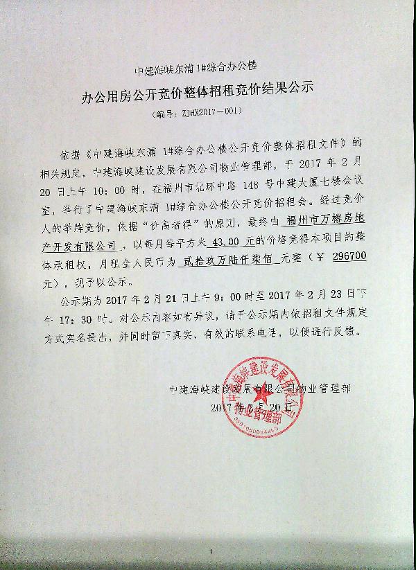 依据《中建海峡东浦1#综合办公楼公开竞价整体招租文件》相关规定,中建海峡建设发展有限公司物业管理部2017年220上午10:00时,在福州市北环中路148号中建大厦七楼会议室,举行中建海峡东浦1#综合办公楼公开竞价招租会经过竞价人的举牌竞价,依据“价高者得”原则,最终 福州市万榕房地产开发有限公司 每月每平方米 43.00 的价格竞得本项目的整体承租权,月租金人民币 拾玖万陆仟柒佰 元整(¥ 296700 元)现予以公示。