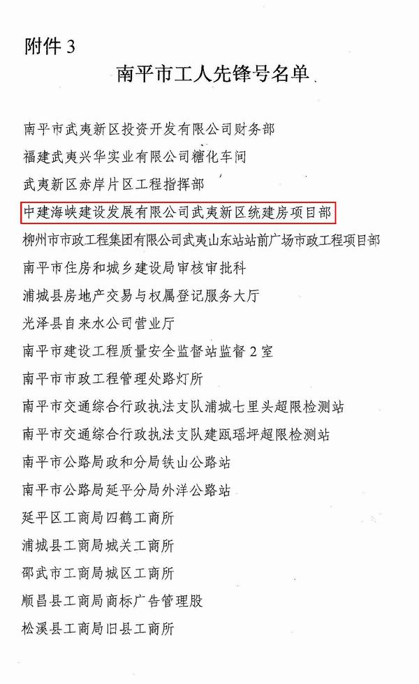 4月28日,从南平市总工会发布南工〔2014〕15号文件及南平总工会召开的关于表彰2013年全市“五大战役立新功、绿色发展奉献”劳动竞赛先进集体和先进个人的决定的会议获悉,中建海峡武夷新区统建房项目部喜获南平市“工人先锋号”荣誉称号。