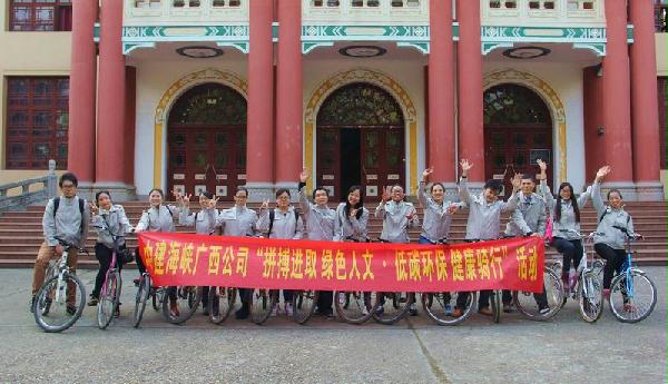 20名分公司员工身着中建统一工服,从广西民族大学的红色大礼堂集体出发,向天雹水库开始了12公里的骑行活动。大家在锻炼身体、凝聚团队拼搏进取精神的同时,还宣传低碳环保理念树立了绿色人文的企业形象。潮气蓬勃的骑行队伍为拥堵的城市道路增添了一道亮丽风景线。