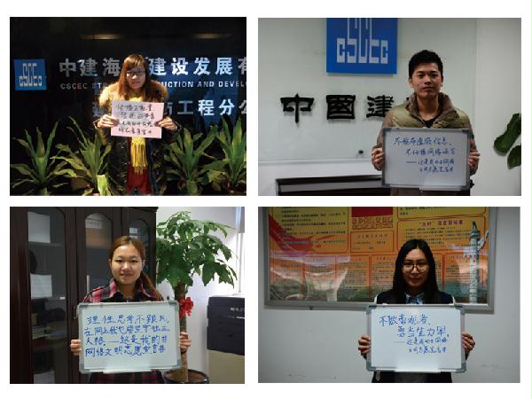 在线下,网络文明倡议接力活动也在全公司范围全面启动,各团(总)支部积极开展“我的网络文明志愿者宣言”接力活动:“理性思考,不跟风,在网上我要也坚守独立人格”、“不做旁观者,勇当生力军”、“传播正能量,传递好声音”等一句句铿锵有力的宣言充分展现了中建海峡青年的良好网络素养和责任担当。