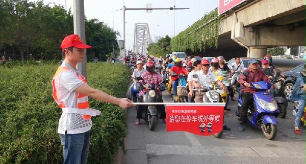 “践行十典九章,争当南宁文明交通使者。”4月27日,中建海峡广西公司十典九章志愿者服务队携手南宁市公安局交警支队五大队开展电动自行车交通秩序大整治专项行动。