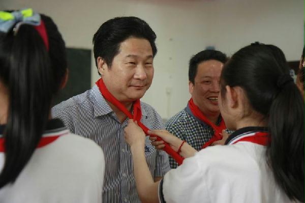 村小学生代表为与会来宾献上了红领巾,中建海峡副总经理兼工会主席张俊华、城郊乡党委书记江平祝愿在座的小朋友们度过一个愉快的儿童节。“我喜欢画画,我的梦想是当一名画家”、“我喜欢打球,我的梦想是当一名警察”……孩子们兴奋地和叔叔阿姨们分享了自己的梦想,稚嫩的脸上洋溢着幸福的笑容。随后,与会来宾还向优秀学生代表和在座的孩子们发放了节日礼物,祝愿他们好好学习,平安成长。地球仪、文具盒、飞镖、乒乓球等等花样繁多的礼物令孩子们欣喜不已,欢声笑语溢满了整个教室。
