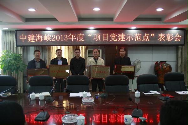 2013年12月31日,中建海峡在福州召开2013年“项目党建示范点”表彰大会,中建海峡党委书记盛祥荣为福州海峡奥体中心等九个项目部分别颁发了牌匾。这是中建海峡深入推进项目党建标准化建设取得的阶段性成果。