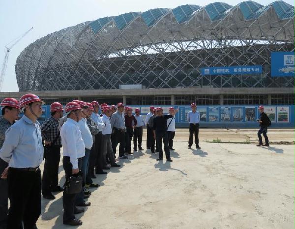4月10日,福建省建筑业协会副秘书长成军携安徽省合肥市建筑业协会会长管晓峰带队的建筑业专家学者一行23人来到中建海峡福州海峡奥体中心项目考察调研工作,福州海峡奥体中心项目党支部书记兼生产经理周永祥、技术部主管陈成等陪同。