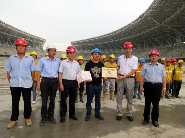 7月3日下午,从中建海峡福州海峡奥体中心项目部传来喜讯,福州海峡奥体中心项目何昌盛脚手架劳务班组荣获“2013年度全国‘安康杯’竞赛优胜班组”荣誉称号。福建省总工会党组书记、副主席陈震、劳动保护部部长聂裔光一行在福州市城建工会副主席吴流河,中建海峡副总经理兼工会主席张俊华,项目党支部书记兼生产经理周永祥等陪同下,莅临福州海峡奥体中心体育场东大门施工现场,为何昌盛脚手架劳务班组进行授牌;并看望慰问了何昌盛脚手架劳务班组职工30余人,为他们发放了慰问品和奖金。