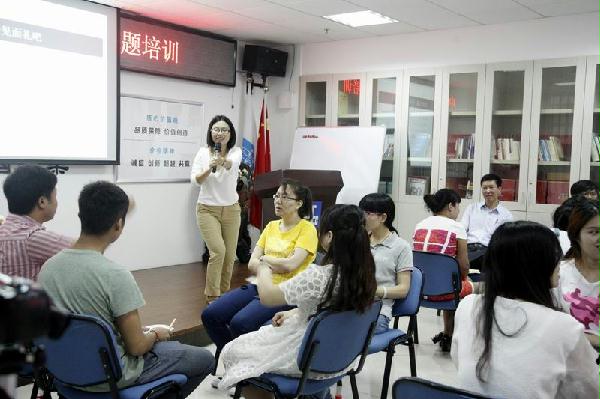 培训班上,福建师范大学传播学院讲师东南卫视特邀策划中央电视台《人物》编导卢佳音老师就演讲技巧为公司70多名演讲爱好者进行专题培训。培训现场没有死板的课桌,没有瞌睡的学员,也没有低头手机党,大家五人一组围圈而坐,如朋友敞心交谈,卢佳音的培训就这样暖心开场。随后,卢佳音更以北大才女张泉灵、央视女主播柴静、浙江工商局长郑宇民的演讲实例,结合现场随机互动,生动风趣地讲解了“细节”、“讲故事”、“打比方”的演讲三原则,现场气氛一路高涨,使大家对演讲有了全新的认识。