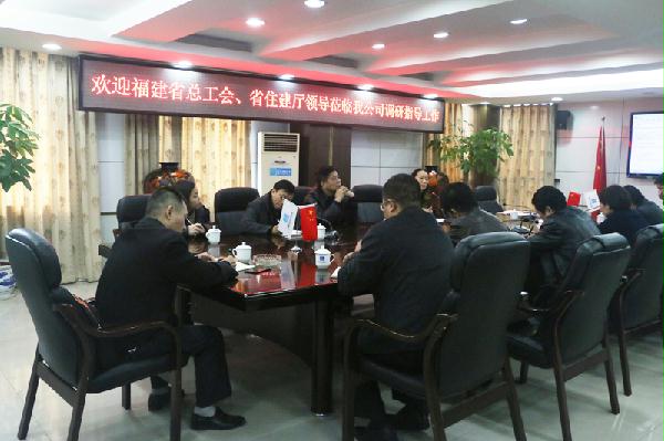 2015年12月29日上午,福建省总工会基层组织建设部部长牛立峰、省住建厅建筑业协会处长谢金泉、省建设建材工会主席许奇一行到中建海峡调研指导农民工服务工作。公司副总经理、工会主席张俊华,工会副主席、工会工作部总经理王会玲,星阳建筑劳务公司总经理吴志鸿等参与调研座谈。